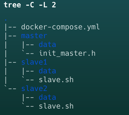mkdir -p mysql-cluster && mkdir -p mysql-cluster/master/data && mkdir -p mysql-cluster/slave1/data && mkdir -p mysql-cluster/slave2/data && touch mysql-cluster/docker-compose.yml && touch mysql-cluster/master/init_master.h && touch mysql-cluster/slave1/slave.sh && touch mysql-cluster/slave2/slave.sh最终创建的目录结构如下